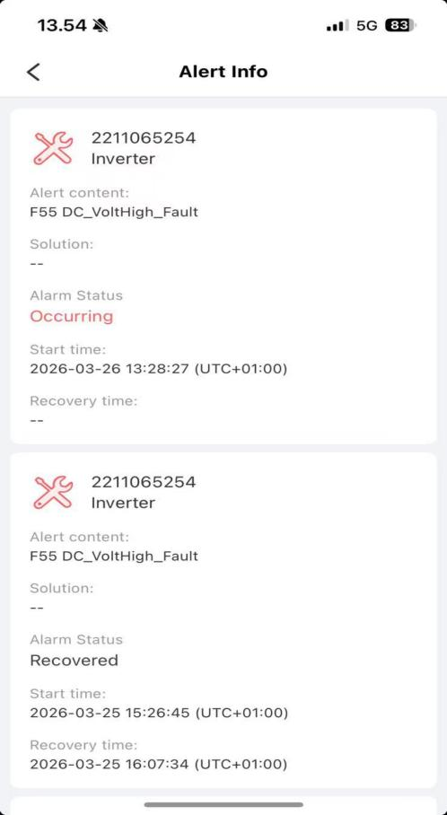 Platforma raportuje F55 DC - Wolt Wysoka - Błąd wskazujący przekroczenie szyny DC napięcie. Usterki występują w godzinach szczytu w ciągu dnia - okresy napromieniowania i automatycznie kasowane, gdy natężenie napromienienia spada. Powtarzający się wzór odpowiada typowemu czasowi przepięcia prądu stałego.