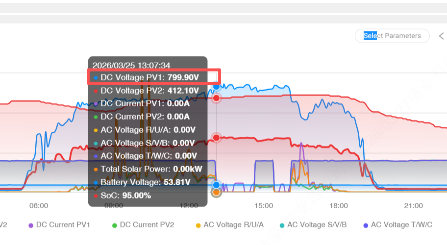 Ten przypadek jest typowy: liczba serii stringów PV1 jest zbyt wysoka, przez co napięcie w obwodzie jałowym osiąga 799,90 V, znacznie przekraczając wartość inwertera ' dozwolone wejście. Przy silnym napromieniowaniu nieuchronnie uruchamia się ochrona przeciwprzepięciowa. W niektórych przypadkach występuje również brak równowagi pomiędzy PV1 i PV2 pod względem typu modułu lub liczby ciągów, co powoduje, że jeden ciąg przekracza bezpieczne napięcie.
