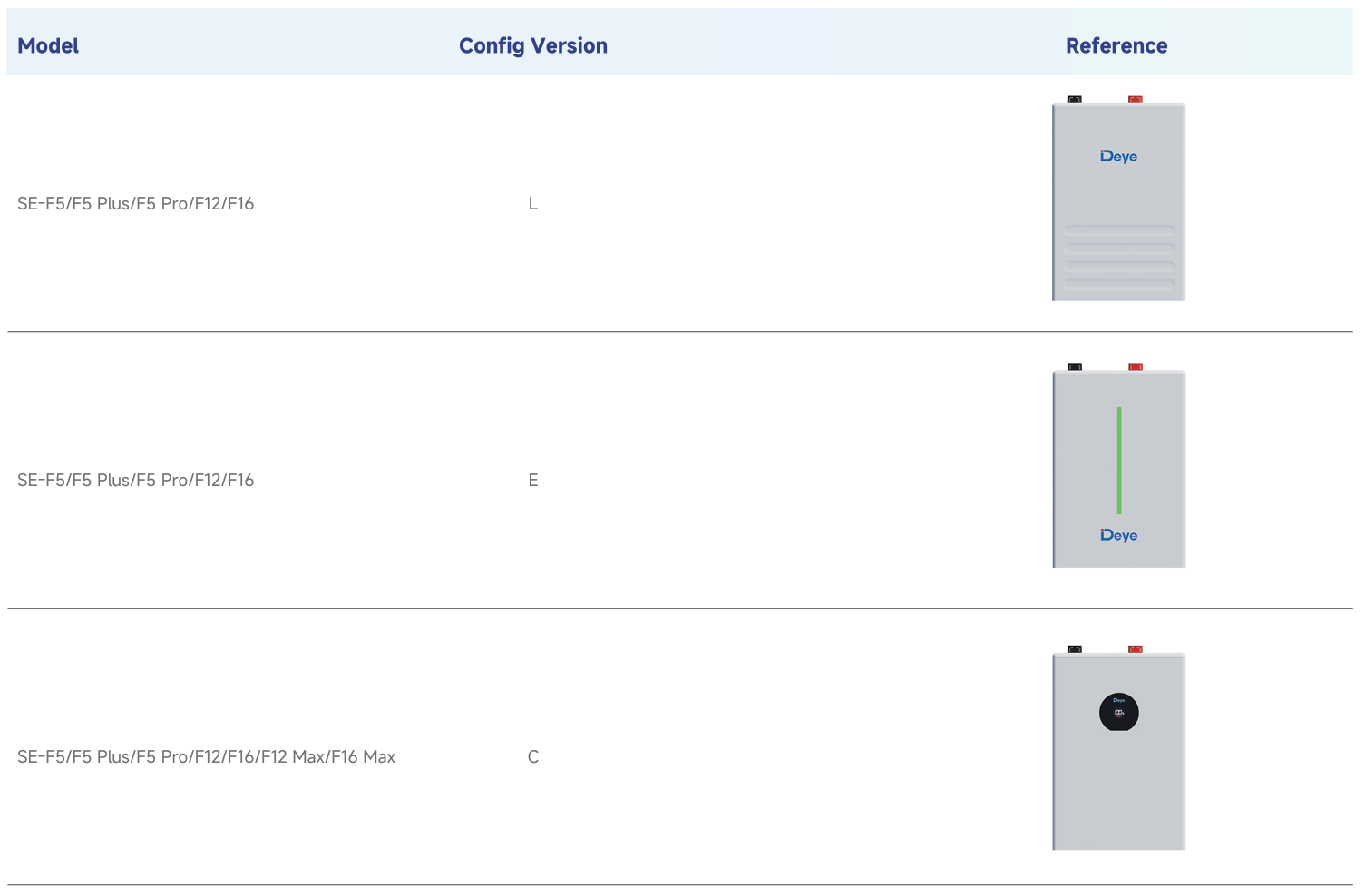 Wszystkie modele SE-F wykorzystują chemię LFP i komunikują się poprzez CAN 2.0 i RS485. Każdy pakiet obsługuje ekspansję równoległą; Broszura Deye określa standardowo do 32 jednostek połączonych równolegle, przy czym większa liczba jednostek równoległych jest pokazana przy użyciu mostka CAN (nadal obowiązuje projekt systemu i lokalne atesty).