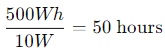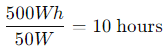 Załóżmy, że chcesz jak najdłużej zasilać urządzenie o mocy 50 W z elektrowni o mocy 200 W i akumulatora 500 Wh.