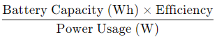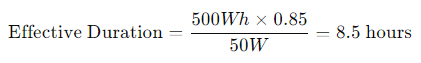 Większość elektrowni nie jest wydajna w 100%, więc w procesie konwersji (z prądu stałego na prąd przemienny lub w wyniku konwersji napięcia) stracisz trochę energii. Zazwyczaj elektrownie mogą mieć sprawność na poziomie około 85–90%. Oznacza to, że jeśli masz baterię 500 Wh, efektywnie możesz wykorzystać jej jedynie około 425–450 Wh.